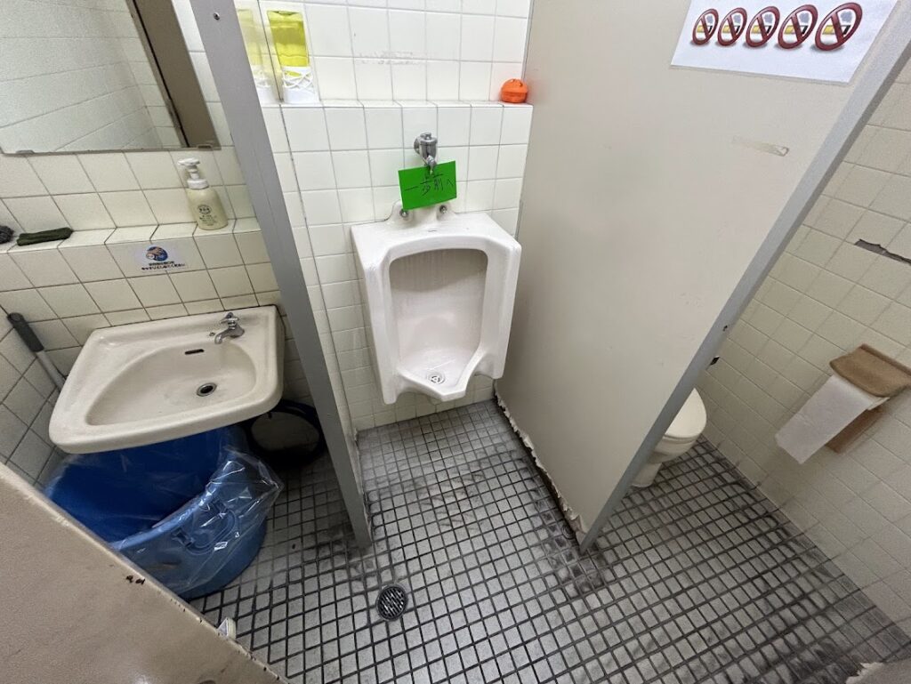 トイレブースの足元はベロベロにめくれ上がり、全体的に劣化しています。
