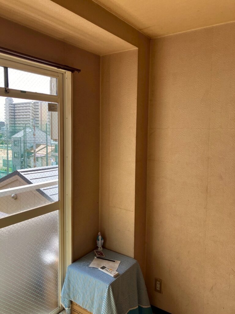 壁紙は全体的に黒ずみや汚れが目立っており、